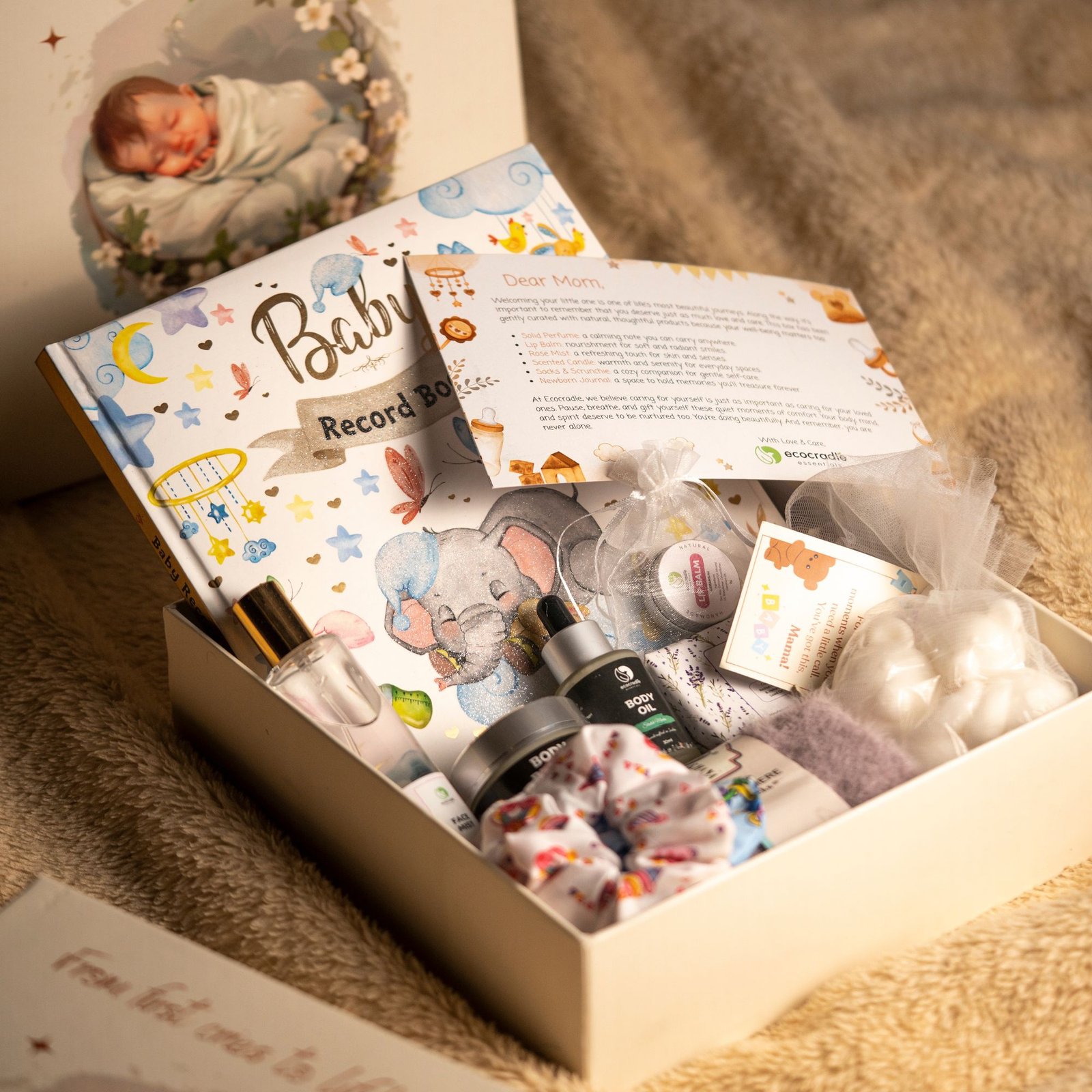 From nourishing skincare to a keepsake baby journal, this hamper brings together moments of care, calm, and connection.